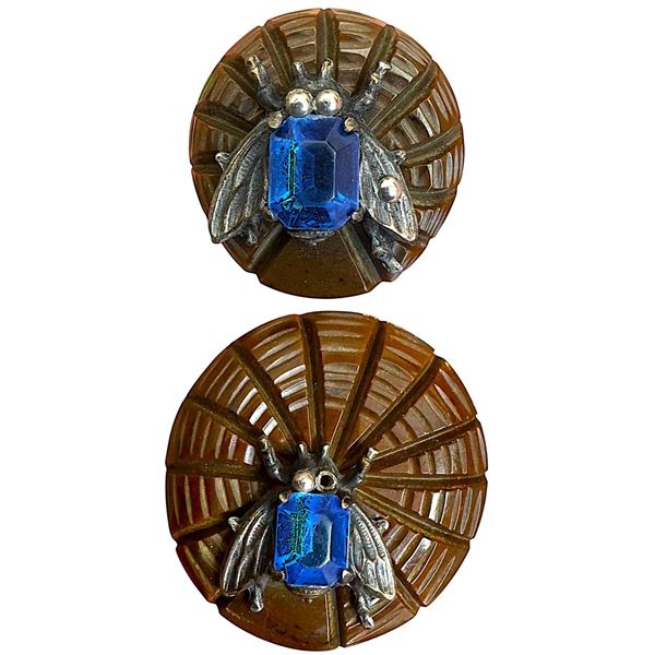 2 Medium/Large 20th century Bakelite jeweled BEE buttons. Here is a mother/daughter pair of carved chunky Bakelite with a white metal and value facete