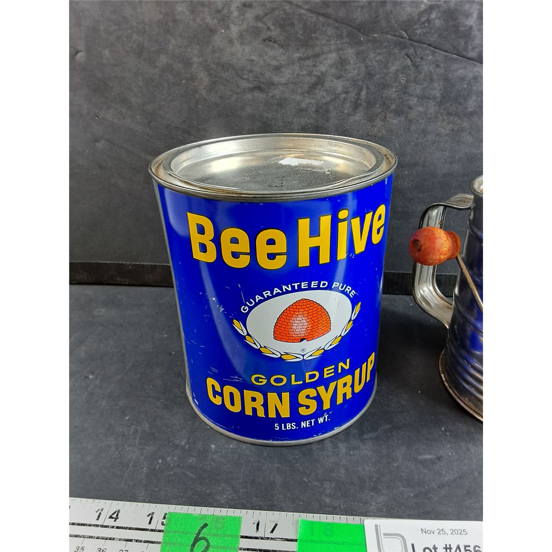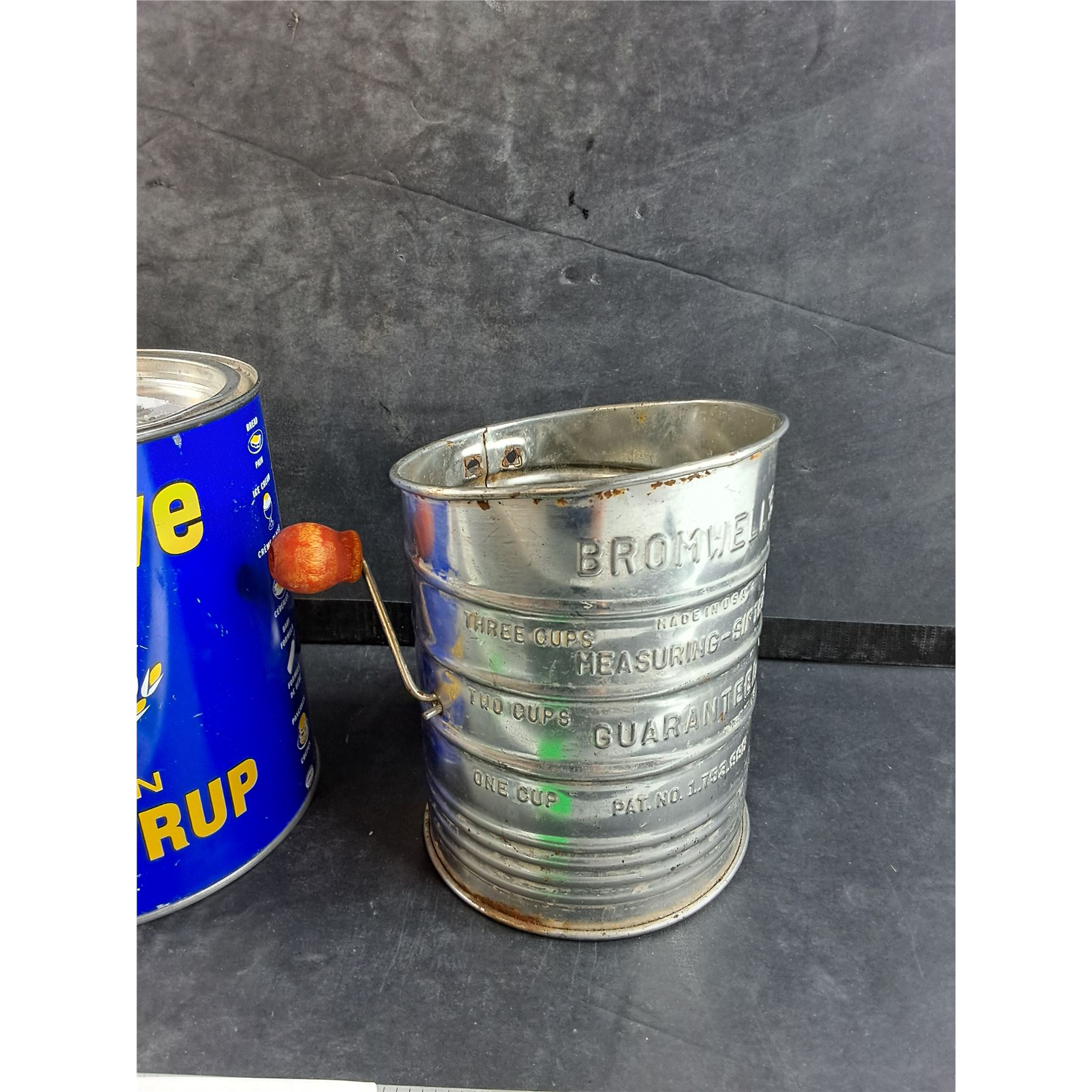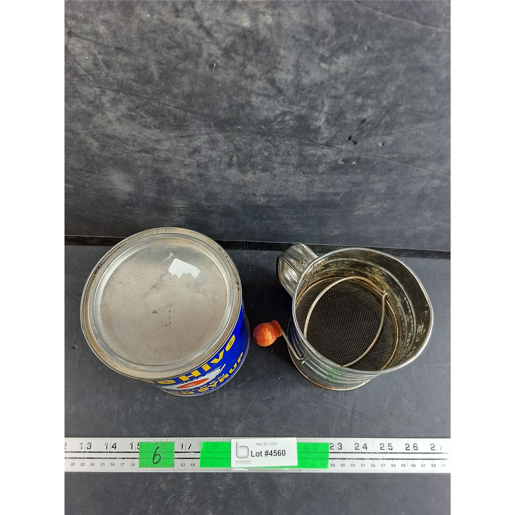 Flour Strainer, Empty BeeHive Corn Syrup Tin