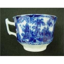 Flow blue Adams "Kyber" cup & saucer.  Circa 1850.  Condition:  slight edge roughness to cup, otherwise good.