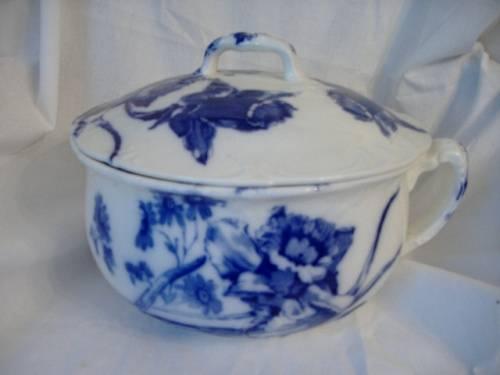 Flow Blue/Blue Willow Covered Chamber Pot w/ Handle