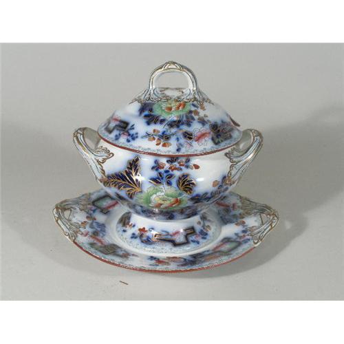 Flow Blue Lidded Sauce Tureen and Underplate - two handled tureen set upon a matching underplate. Mildly oriental floral patterns accented with gilt highlights. Each element is signed with an 'L' in blue underglaze. Dimensions - 8.5"diameter x 7.5"h