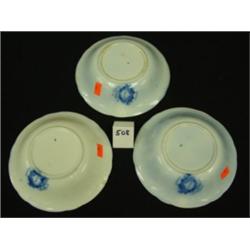 Flow Blue "Oriental" by Ridgeways, England. Lot of 3 deep bowls. Bowls are 1.5" deep and 6.25" wide. Condition: Two are in very good condition. One has 3 chips under rim. Some scratches in each.