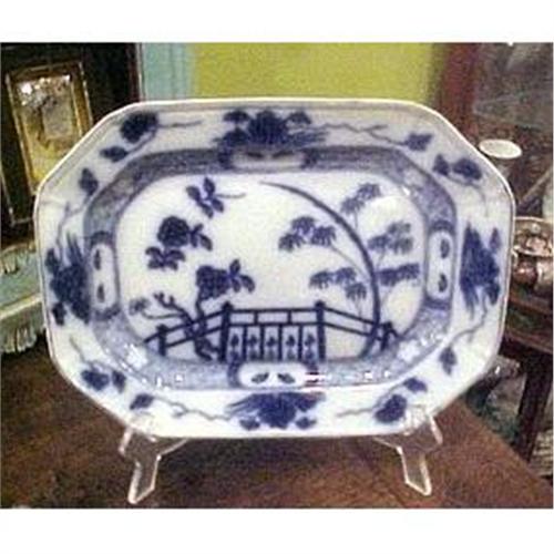 This is a lovely platter in blue and white in a design called "Indian Bridge". It is a spare pattern with lots of white space, which gives it a great look. By Samuel Alcock, around 1850. The tray is 13" by 10" and in excellent condition.