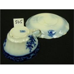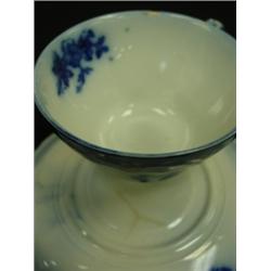 Flow Blue "Touraine" by Stanley Pottery, England. Teacup & saucer. Saucer is 6" wide. Cup is 2.25" tall and 4" wide. Condition: Cup has a single edge chip. Saucer has a hairline and multiple edge chips visible only from underside.