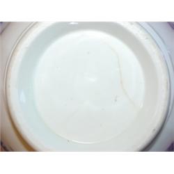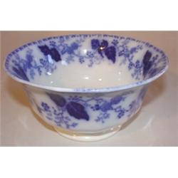 Flow Blue waste bowl. Stands 3 1/2" tall and 7" in dia. Has a hairline crack to base.
