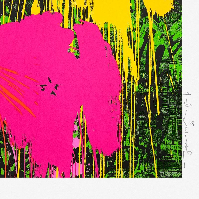 "Flowarh$" is a limited edition silk screen on paper by Mr Brainwash. The piece is a Studio Proof, hand signed and thumb-printed by the artist. The piece comes custom framed and with a Certificate of Authenticity. Measures approx. 36" x 36" (frame), 24" x 24" (image).