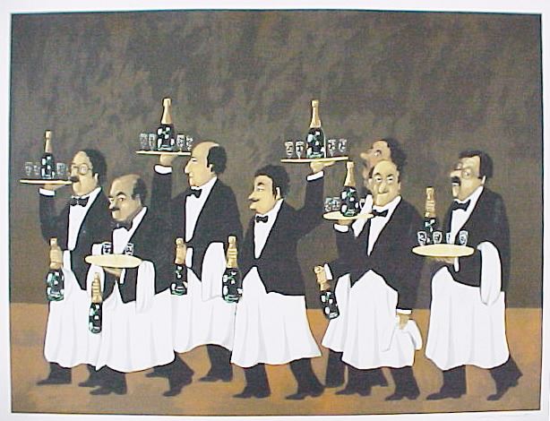 French/American national treasure , Guy Buffet, entertains us as always with his wonderful vision of the delights of fine dining and drink . The world reknowned Perrieer Jouet flower bottle is honored here in one of his best-loved limited editions . It also earned Buffet a contract to become Official Artist of the Perrier Jouet champagne company. Serigraph on Paper 28x37"