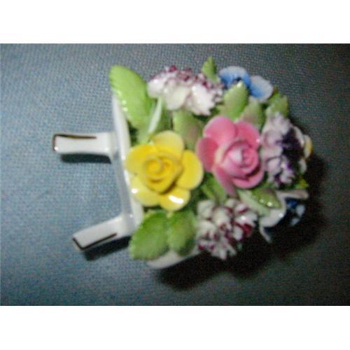 This 2.5 inch flower cart of a porcelain is incredibly gorgeous filled with multicolor handcrafted and painted flowers. It is in excellent condition, vintage imperfection. It also has gold trimming. On the base is marked with several symbols and indicates Royal Adderley FLORAL Bone China , Made in England. It would make a decorative conversational design. It is 3.5 inch wide.