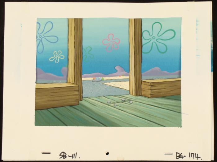 This original hand-painted background from the Nickelodeon TV show SpongeBob Squarepants. The story takes place under the deep blue sea in Bikini Bottom, where SpongeBob resides. SpongeBob, who is a yellow, porous sponge, is your typical happy-go-lucky character, as he is always cheerful and enjoys making people laugh. Patrick Star, SpongeBob's neighbor who is a starfish, is your average children's show idiot, as he boasts knowing nothing and is often getting himself into ridiculous situations. Between the homes of these two lies the home of the miserable Squidward, a squid, who is known for being grouchy and playing tricks on SpongeBob and Patrick. Both SpongeBob and Squidward work at the Krusty Krab, a fast food business run by the greedy money-loving Mr. Krabs, a crab, the arch rival of the evil, possibly misunderstood, Plankton. Another neighbor, Sandy Cheeks, an athletic squirrel who normally wears an astronaut's space suit, was introduced in "Tea at the Treedome." She spends most of her time inventing and experimenting. Why do the clouds look like flowers?Original Production Background Overall Size of Background: 10 1/2" x 13 1/2" Very good conditionOriginal Production Backgrounds are used in the making of the final version of animated productions. The background establishes the location and the overall good mood of the scenee. Typically, a background layout artist creates a drawing to establish the content of the scene, placement of characters, perspective and camera angle. Based on this drawing, the background artist creates a preliminary painting to confirm all of the scenes details, then the final production background which is used in the filming of the scene. When these backgrounds are individually photographed behind the progression of production cels, and projected at a rapid succession, the images in the foreground appear to move, creating an animated scene. The background is ready to be matted and framed. It is a colored background with the animator's notations at the bottom. The background has multiple layers. The first layer is a cel with a paper border and there are paper cut-outs on the cel.