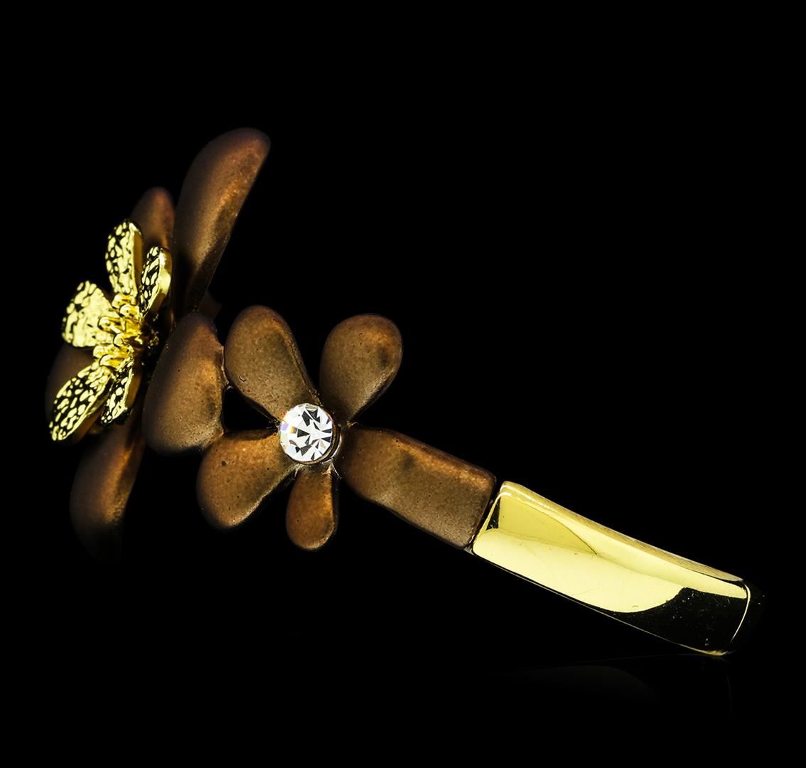 High end designer jewelry. Flower Hand Painted Bracelet - Gold Plated. Gold Plated Metal/ Crystal Detail. Bronze/ Gold. Elastic. Total Weight: 25.5 grams.