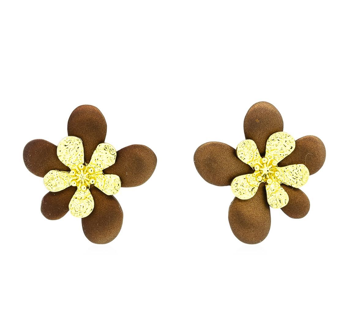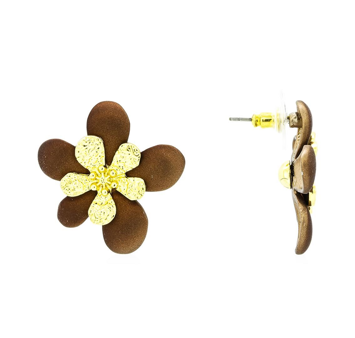 High end designer jewelry. Flower Hand Painted Earrings - Gold Plated. Gold Plated Metal Set. Bronze/ Gold. Stud. Total Weight: 9.3 grams.