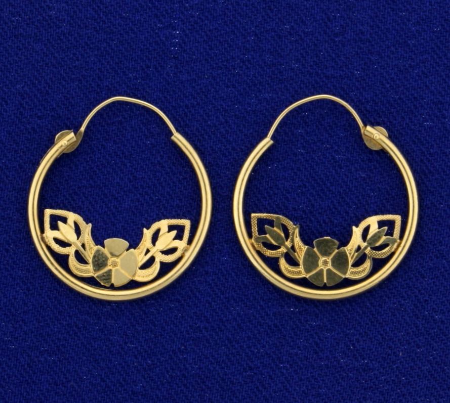 In 14k yellow gold, with a 3/4 inch diameter. 1.3mm wide. 0.8g.