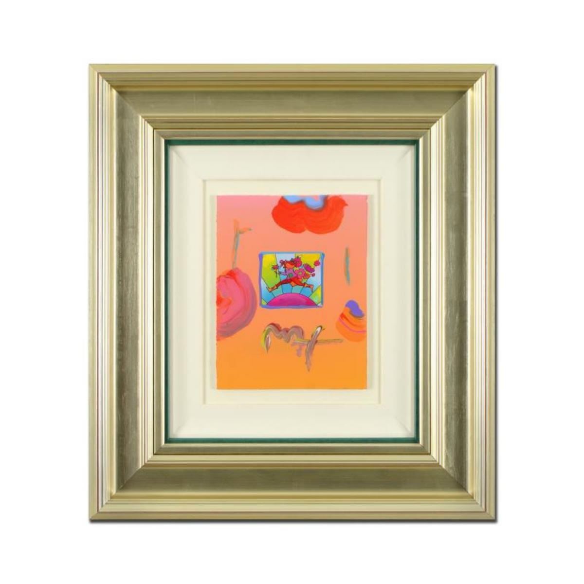 "Flower Jumper Over Sunrise" is a one-of-a-kind acrylic mixed media on paper, hand signed by Peter Max. Includes Certificate of Authenticity from Peter Max Studios. This piece comes custom framed. Measures approx. 22" x 25.5" (with frame), 8.5" x 11" (image).