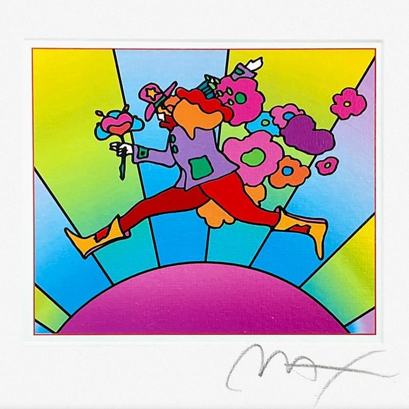 "Flower Jumper Over Sunrise on Blends I" is a limited edition lithograph on paper by Peter Max numbered and hand signed by the artist. This piece comes framed. Includes Certificate of Authenticity from Peter Max Studios. Measures approx. 14.5" x 15.5" (frame) 4.5" x 5.5" (image).