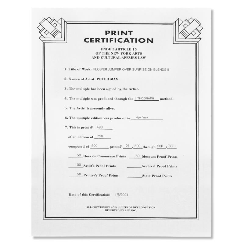 "Flower Jumper Over Sunrise on Blends II" is a limited edition lithograph on paper by Peter Max, numbered 498/500 and hand signed by the artist. This piece comes framed. Includes Certificate of Authenticity from Peter Max Studios. Measures approximately 23.5" x 26" (frame), 10" x 13" (image).