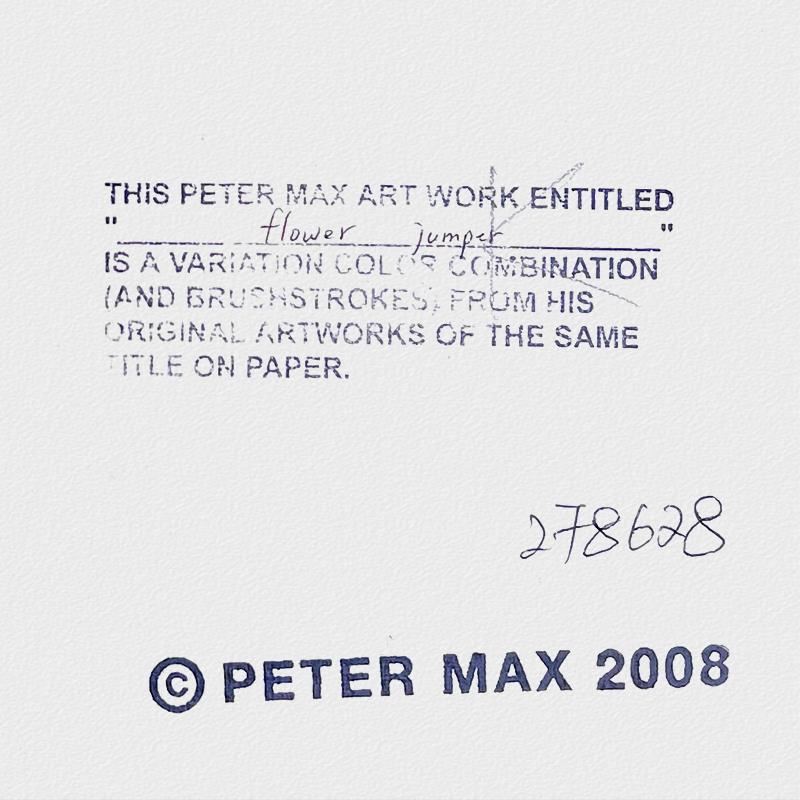 "Flower Jumper" is a hand signed one-of-a-kind acrylic mixed media on paper by Peter Max. The piece comes custom framed with a backside cutout to display Peter Max Studio registration number 278628 certifying authenticity. Measures approximately 26" x 23" (frame), 13" x 10" (image). This item requires special handling and may have a longer than usual turnaround.