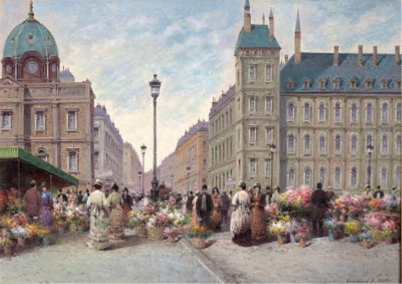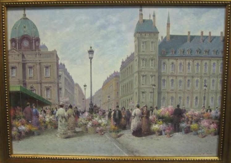 VASILY NICHOLAYEVICH GRIBENNIKOV, RUSSIAN (B. 1957 Flower market, 2007, oil on canvas, signed and dated lower right and again verso, gilt-framed. 19 1/2 x 27 1/2 inches