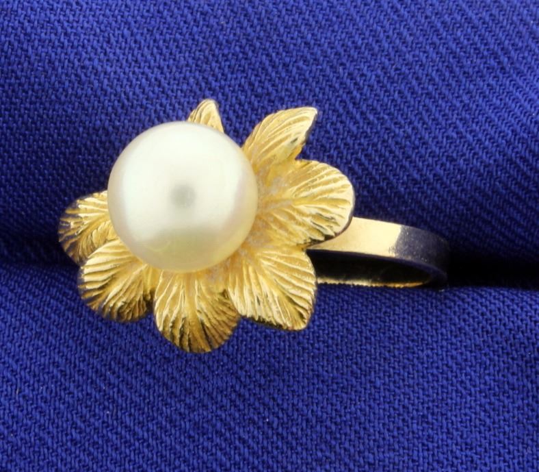 In 14k yellow gold this ring has a cultured pearl center that is 8 1/2mm with excellent color and luster. Size 7 1/4 5.8g