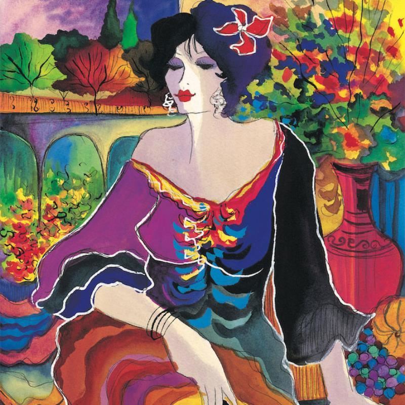 "Flower Shop" is a limited edition Giclee on Canvas by Patricia Govezensky. The piece is numbered, hand signed by the artist, and come with a letter of authenticity. Measures approximately 10" x 8".