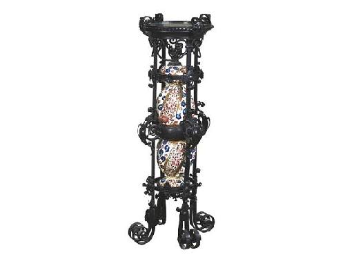Wrought iron painted black. In the middle there are vase form majolica inlays facing each other. Colour painted floral motifs and gilt. The majolica inlays are cracked. Hungarian, second half 19th century. Size: 100 cm