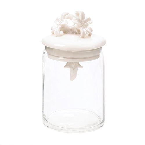 Flower Top Jar **|**|** Flowers bloom on the porcelain top of this charming glass jar. The ivory lid features pretty flowers and a decorative final that hangs below. Fill the jar with decorative items or simply display it solo - either way, its an appealing addition to your decor. Item weight: 1 lb. 3-1/2 x 3-1/2" x 6-1/8" high. Porcelain and glass."