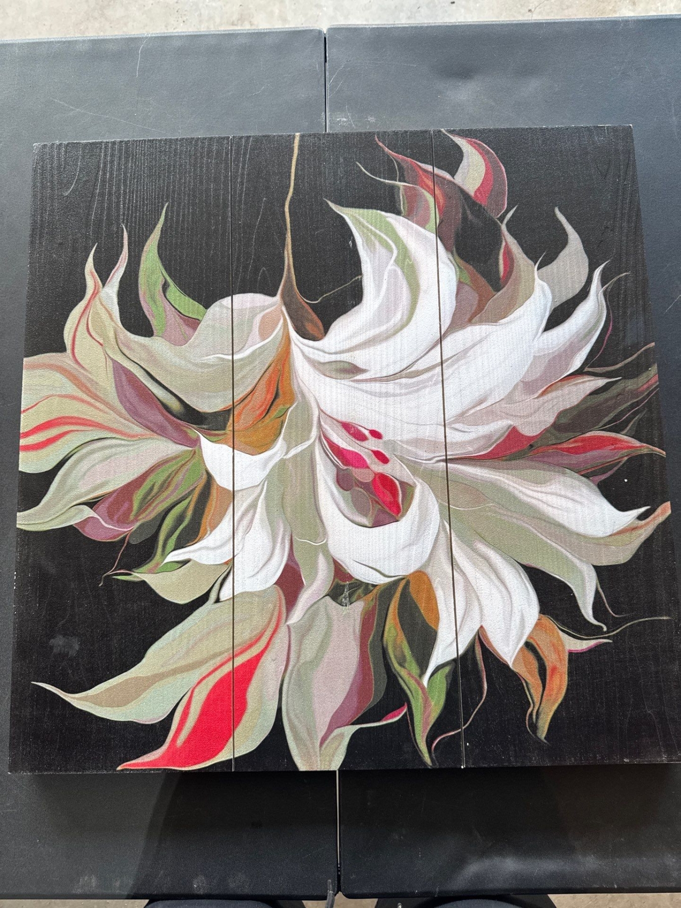 Flower painting on wood. 23 and a quarter wide by 23 and a quarter wide.