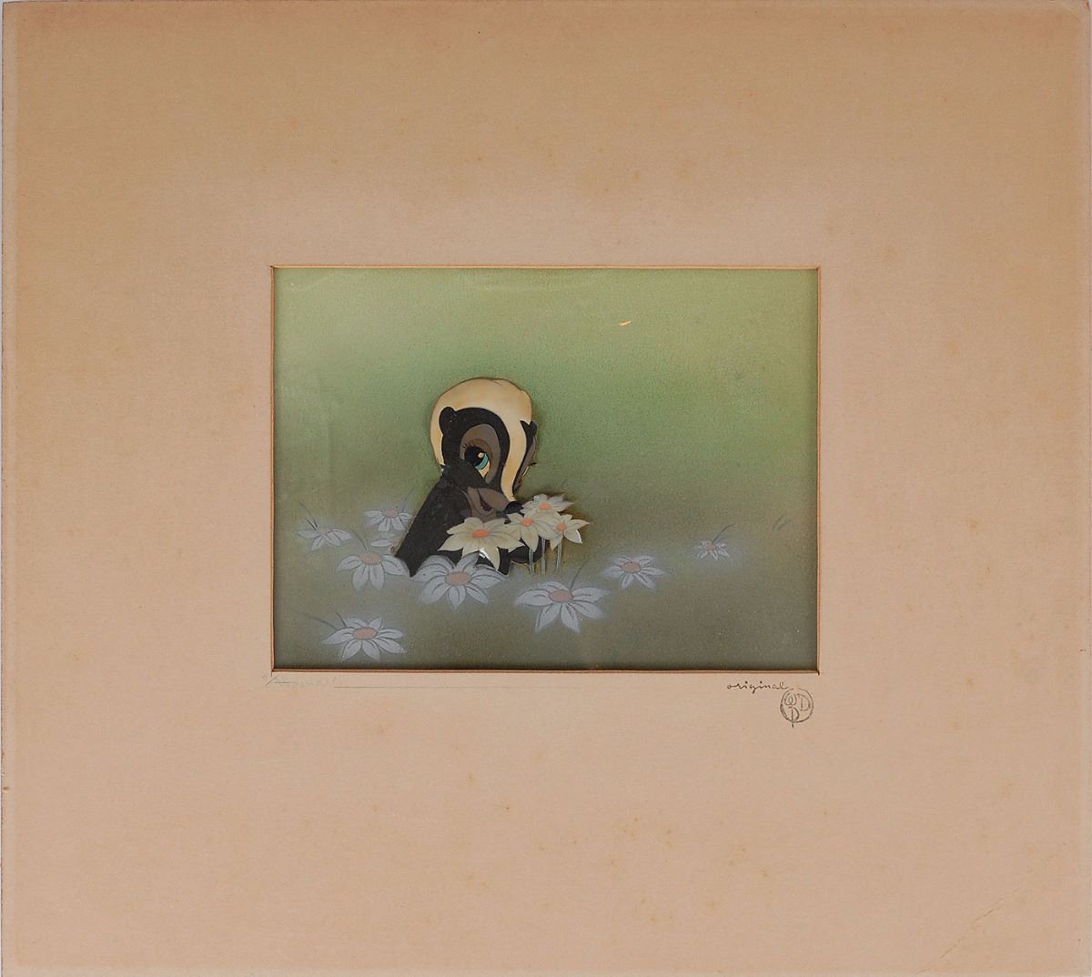 (Walt Disney Studios, 1942) Original production cel set-up featuring Flower from Bambi. The cel has been trimmed and applied to an airbrushed background as prepared by Courvoisier Galleries for sale, embellished with a series of hand-painted flowers. Image measures 2.25 x 2, with a mat opening of 6 x 4.5. Mat dimensions are 12 x 11. The piece has the Courvoisier penciled caption and encircled Walt Disney Productions “Original WDP” stamp below mat opening. In very good condition, with some rippling to the cel and trimmed edges, foxing, and toning to mat.