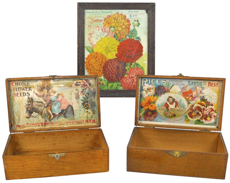 Flower seed display boxes (2), Rice's Flower Seeds-Cambridge, NY & Choice Flower Seeds from D.M. Ferry & Co.-Detroit, Mich, both w/paper lithos, one VG to Exc, other is Fair & Panmure Dahlias framed litho, VG cond w/small pc missing from corner, 11.5"H x 9.5"W.