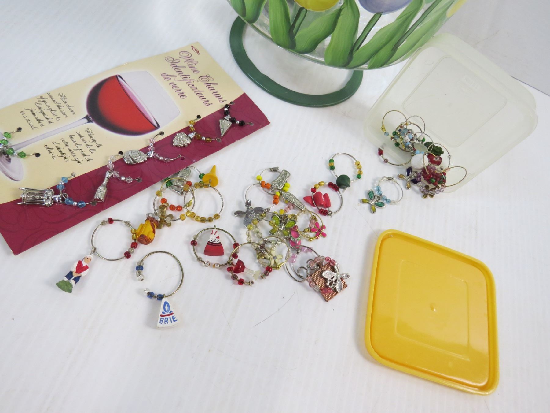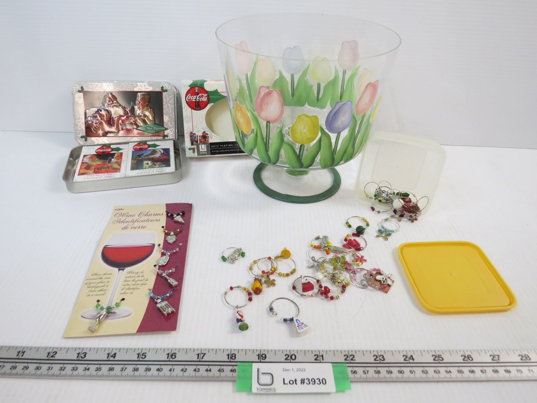 Flowered Glass Container - Coca-Cola Cards in Christmas Tin - Wine Glass Identification Rings