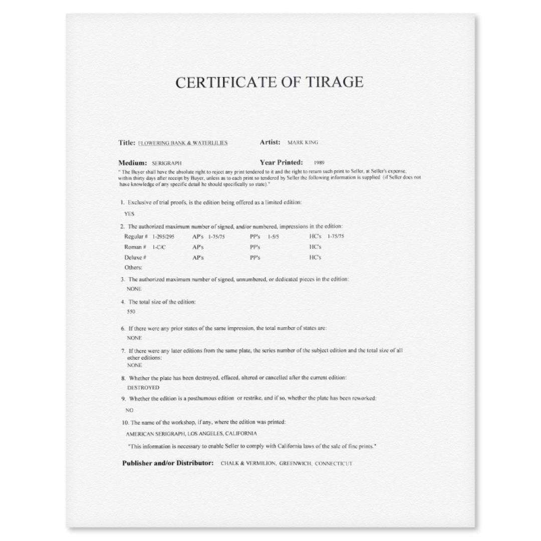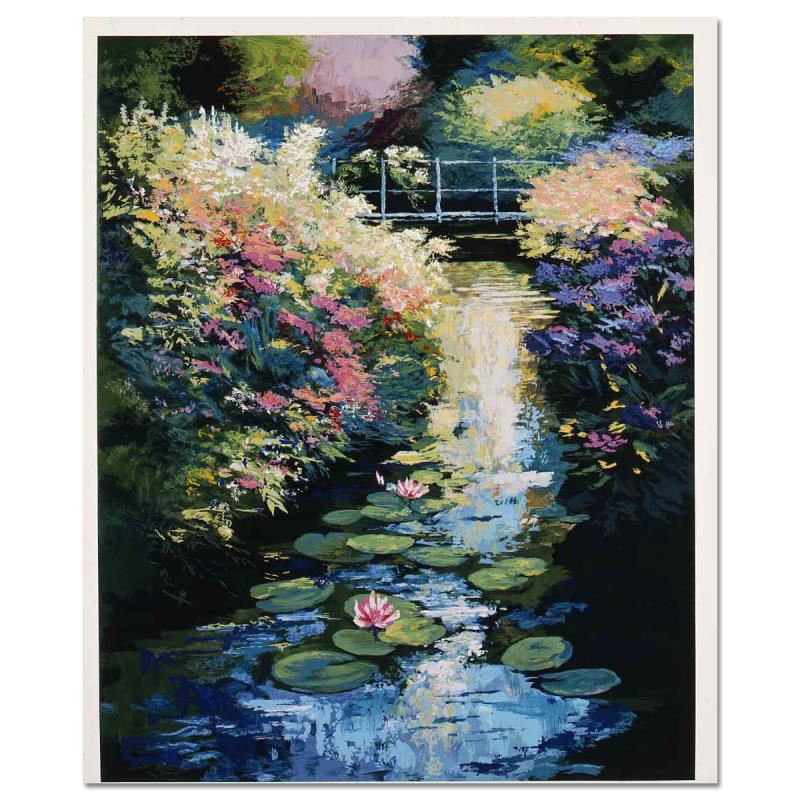 "Flowering Bank & Waterlilies" is a limited edition serigraph on paper by Mark King (1931-2014). Hand signed and numbered this piece comes with a letter of authenticity and measures approximately 30" x 24" (image).