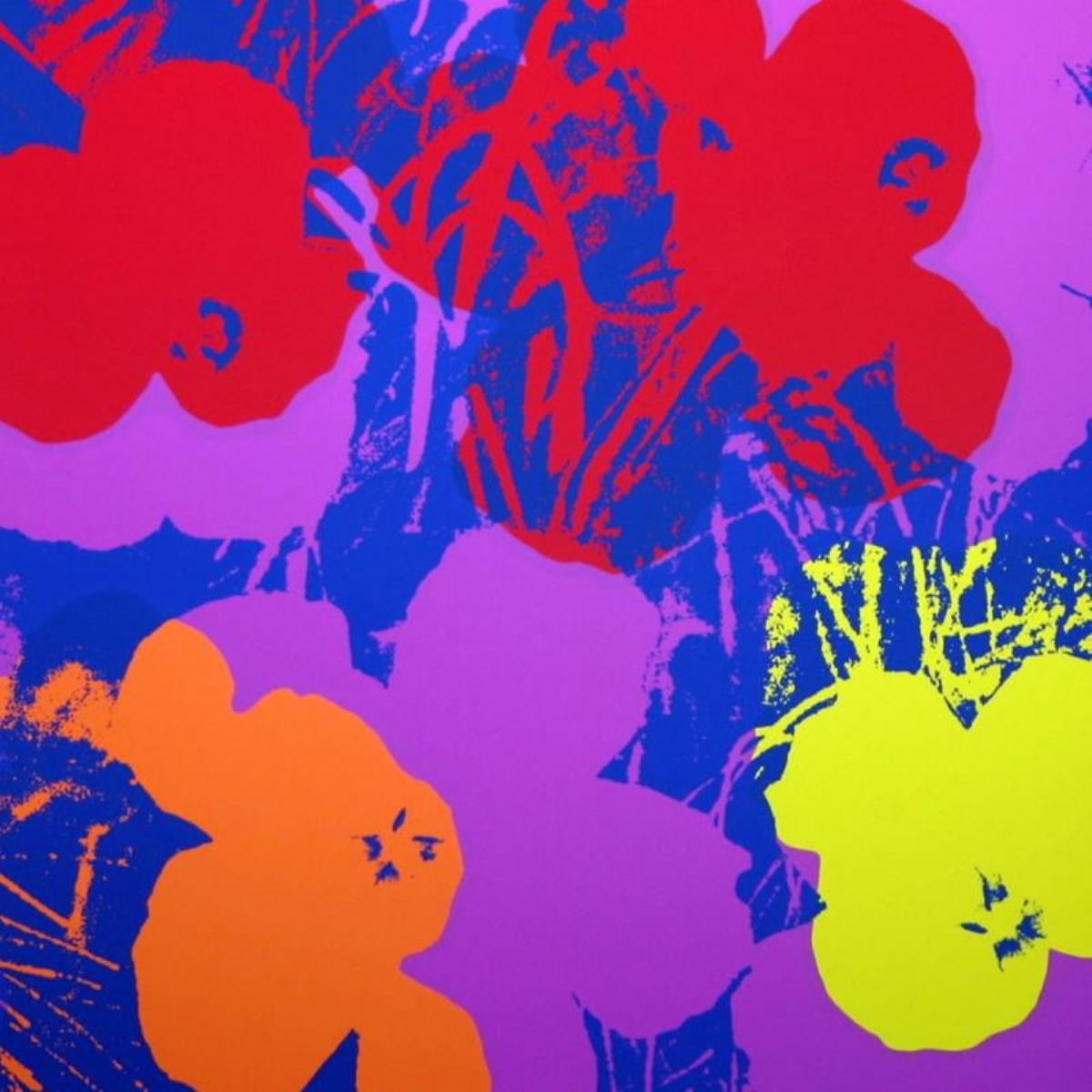 "Flowers 11.66" is a silk screen print on paper (open edition) from Sunday B Morning featuring the works of Andy Warhol. The piece is stamped in blue on the back with "Published by Sunday B. Morning" and "fill in your own signature" and is accompanied by a certificate of authenticity. Measures approximately 36" x 36".