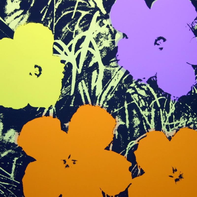 "Flowers 11.67" is a silk screen print on paper (open edition) from Sunday B Morning featuring the works of Andy Warhol. The piece is stamped in blue on the back with "Published by Sunday B. Morning" and "fill in your own signature" and is accompanied by a certificate of authenticity. Measures approximately 36" x 36".