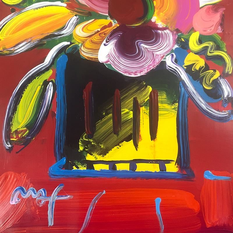 "Flowers 2" is a one-of-a-kind acrylic mixed media on paper, hand signed by Peter Max. The piece comes custom framed with a backside cutout to display Peter Max Studio registration number 242548 certifying authenticity. Measures approx. 48.5" x 36.5" (frame), 36" x 24" (image).