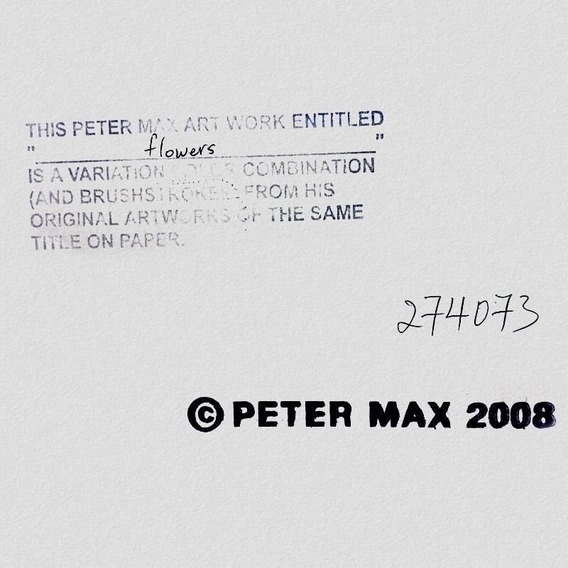 "Flowers II" is a one-of-a-kind mixed media on paper, hand signed by Peter Max. The piece comes custom framed with a backside cutout to display Peter Max Studio registration number 274073 certifying authenticity. Measures approximately 48" x 36" (frame), 36" x 24" (image). This item requires special handling and may have a longer than usual turnaround.