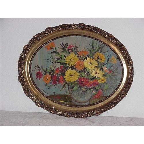 A small oil painting, 19" X 15" in oval gold frame. Painted on canvas over masonite. Colorful with a pretty frame.