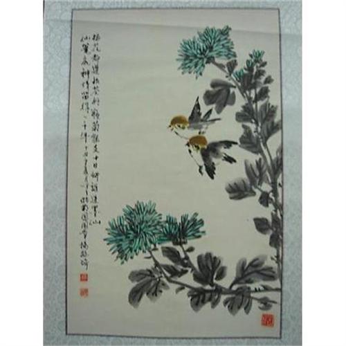 The closed sides and bottom of this painting works to emphasize the openness of the top, allowing the beautifully rendered sparrows to fly free and lift the entire painting upward, along with the upward motion of the flowers, into an inspiring sky-reaching, dance-like movement. Mount: 62 x 22 inches, 157.5 x 56 cm. Painting: 26.5 x 17 inches, 67 x 43 cm