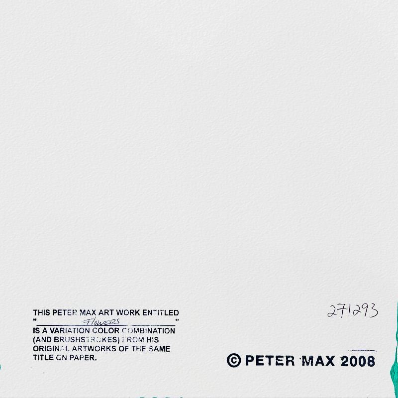 "Flowers" is a hand signed one-of-a-kind acrylic mixed media on paper by Peter Max. The piece comes custom framed with a backside cutout to display Peter Max Studio registration number 271293 certifying authenticity. Measures approximately 26" x 23" (frame), 13" x 10" (image). This item requires special handling and may have a longer than usual turnaround.