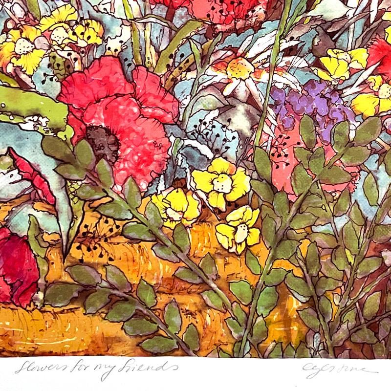 "Flowers for My Friend" is a limited edition lithograph on paper by Sara Eyestone, numbered and hand signed by the artist. Includes Letter of Authenticity. Measures approx. 29" x 22" (border), 23" x 17" (image). There may be minor imperfections in the white border area (crease and/or very small tears) that may be concealed when the piece is framed.