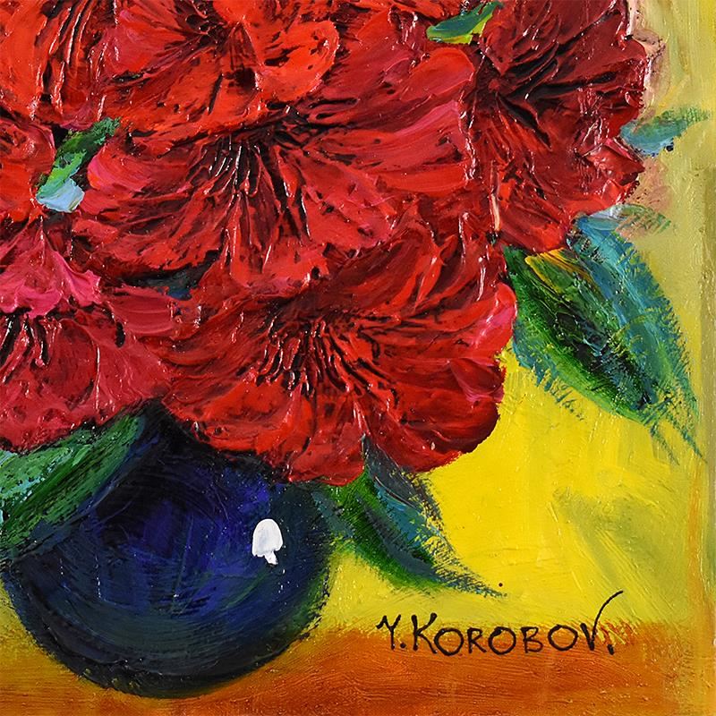 Flowers in Blue Vase is an original acrylic painting on canvas by Yana Korobov, hand signed by the artist. Includes Letter of Authenticity. Measures approx. 24" x 24" (image).