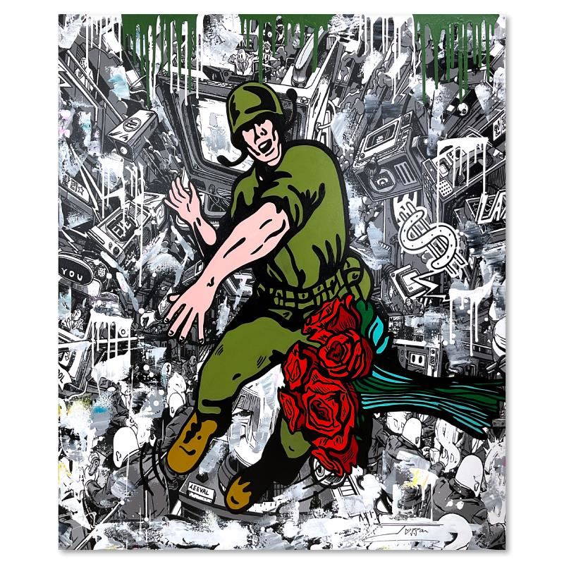 "Flowers to You" is a unique mixed media acrylic on gallery wrapped canvas by Jozza. Hand Signed by the artist and titled in verso, the piece comes with a letter of authenticity. Measures approximately 48" x 40" (image).