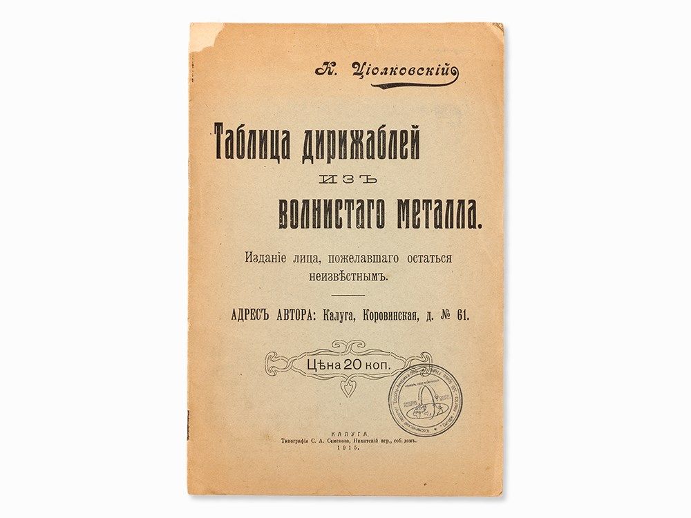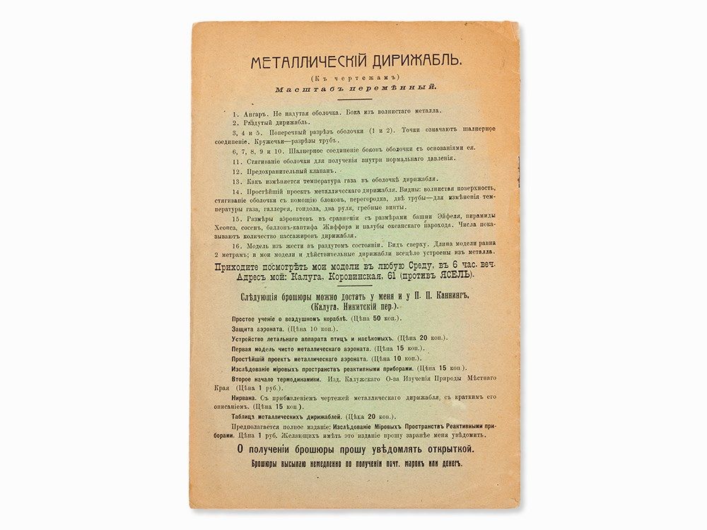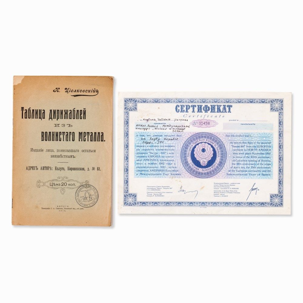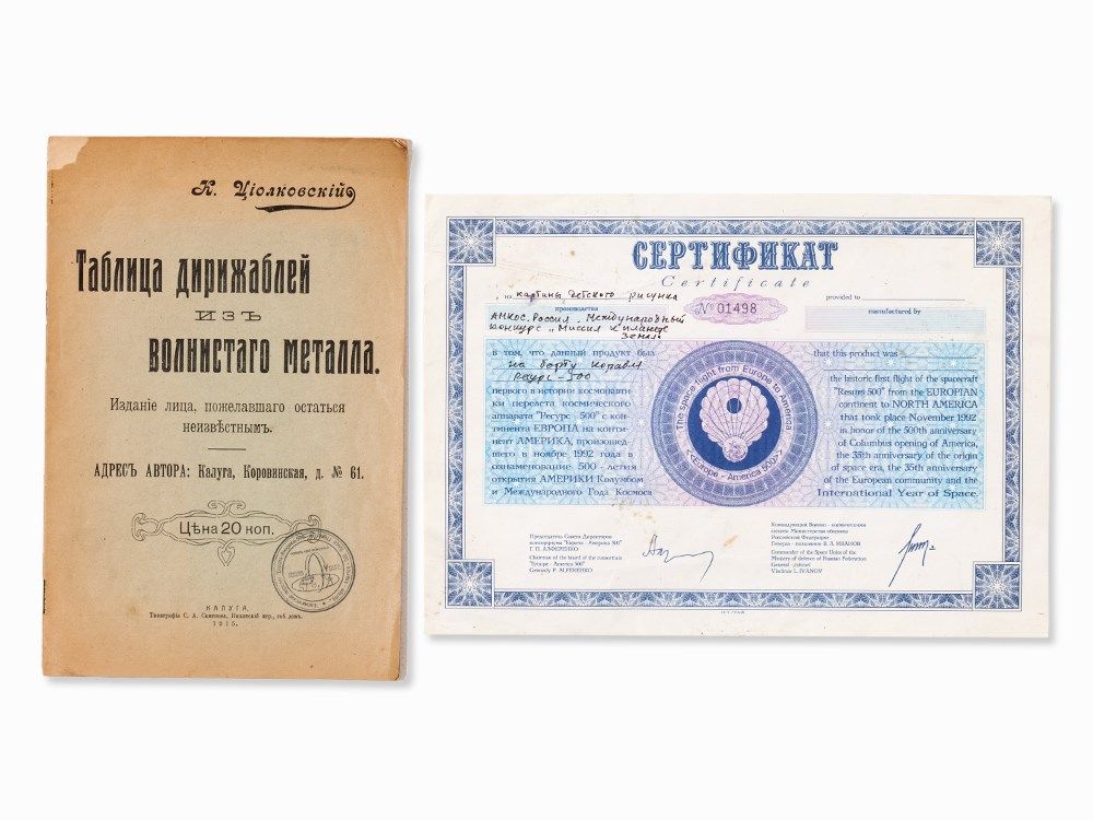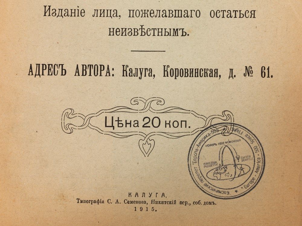 The booklet about the beginnings of the developments of space missiles by Konstantin Eduardovich Tsiolkovsky has flown with this mission and was accredited with the mission stamp. It is written in Cyrillic, dates to 1915 and was published in Kaluga.