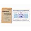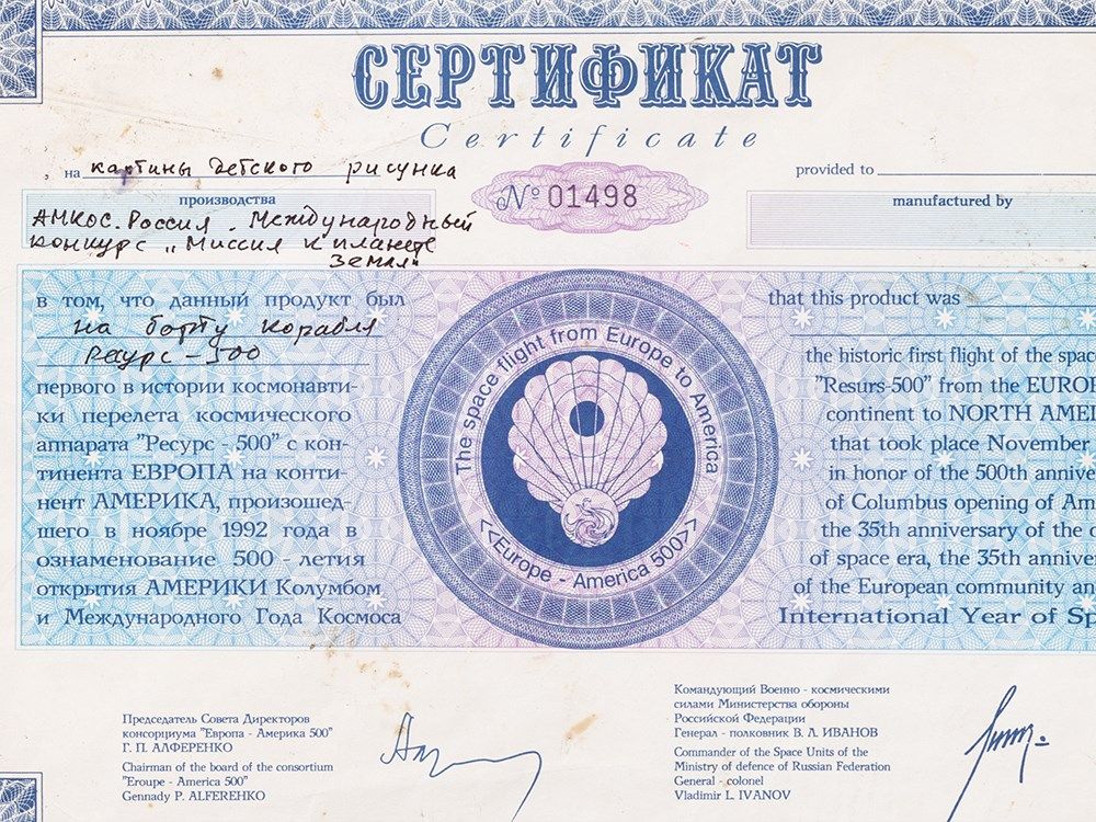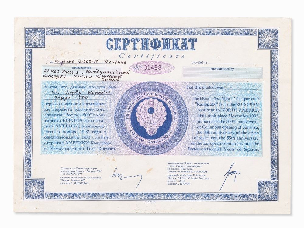 The certificate was issued in honor of the historic first flight of the spacecraft ‘Resurs-500’ from the European continent to North America that took place in November 1992. The certificate is inscribed in Cyrillic in black pen and numbered ‘01498’.