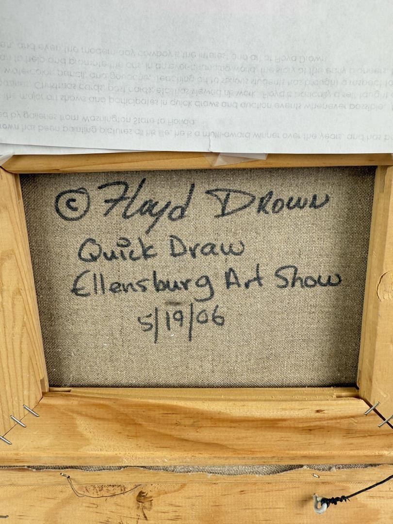 Tick is Quick Draw Ellensburg Art Show. 8" by 10". 15" by 17" framed. Oil on Canvas. Floyd Drown (20th/21st Century) is active/lives in Oregon. Floyd Drown is known for Painting.