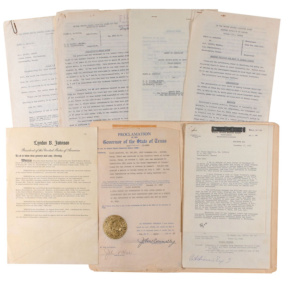 Remainder of the collection consists of copies of Hamilton's appeals in which he contests his consecutive sentences, each bearing his initials "FGH" on the bottom margin of the first page of each document, with one document still clipped in its original legal folder. In overall very good condition, with paper loss to the bottom of Connally’s document.