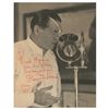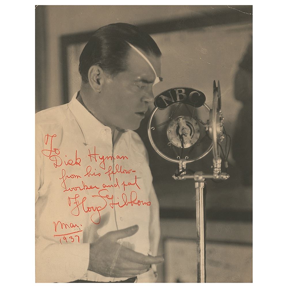 War correspondent (1887-1939) who lived a life of danger; he was one of radio's first news commentators, known for his fast-talking delivery. Serving as a World War I correspondent, Gibbons lost an eye after being hit by German gunfire while attempting to rescue an American soldier at the Battle of Belleau Wood, France. Vintage matte-finish 10.75 x 13.75 photo of Gibbons smoking a cigarette during an NBC radio broadcast, signed and inscribed in red pencil, "To Dick Hyman, from his fellow-worker and pal, Floyd Gibbons, Mar, 1937." In fine condition, with a crease to the upper right corner.