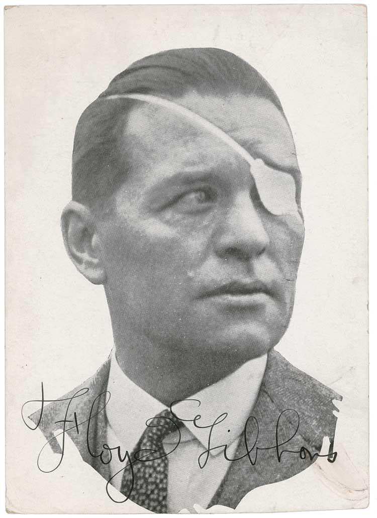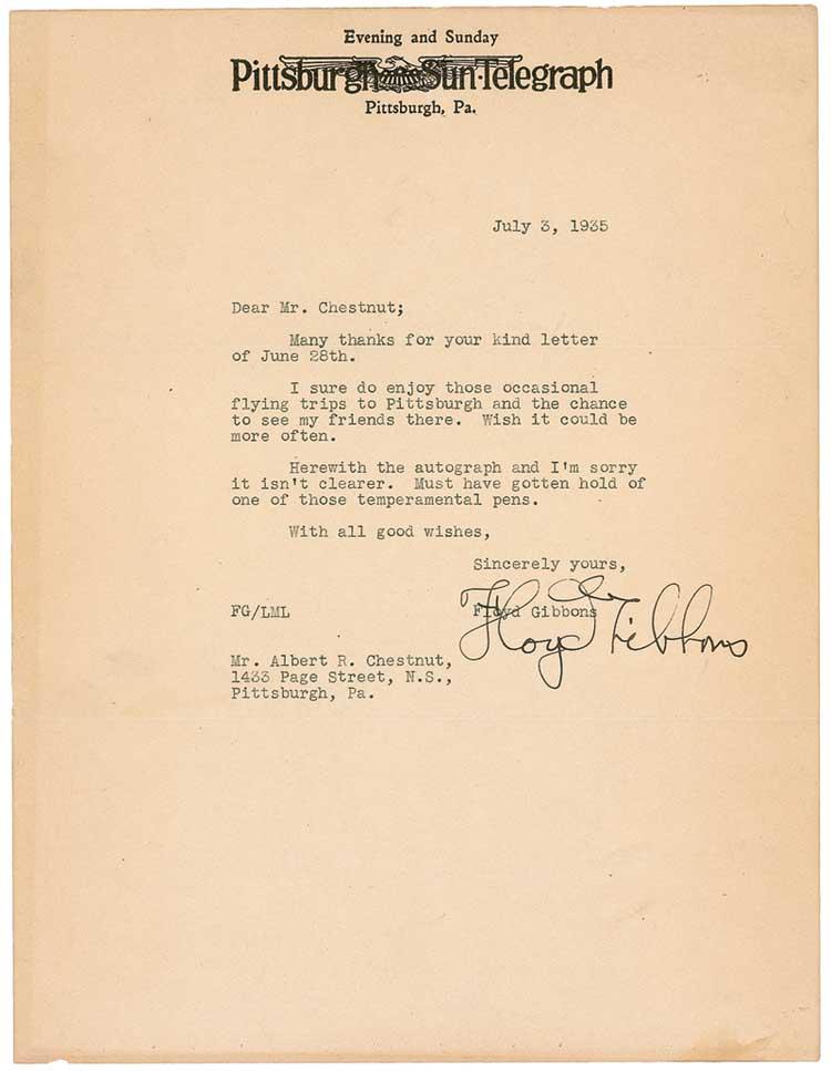 War correspondent who lived a life of danger; he was one of radio’s first news commentators, known for his fast talking delivery. Two items: TLS, one page, 8.25 x 10.75, Pittsburgh Sun Telegraph letterhead, July 3, 1935. Gibbons mentions enjoying “those occasional flying trips to Pittsburgh” and sends his autograph, signed with “one of those temperamental pens.” Also included is a vintage 5.5 x 7.5 cardstock signed portrait of the eye-patched aviator. In overall fine condition, with a line of pin holes to the bottom of the uniformly toned letter and some light soiling to the signed photo. RRAuction COA.