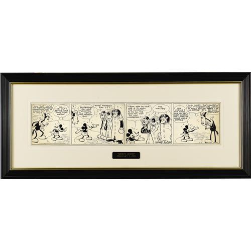 <B>Floyd Gottfredson - Mickey Mouse Daily Comic Strip Original Art, dated 2-3-33 (Walt Disney Enterprises, 1933).</B></I> From the "Blaggard Castle" storyline comes this wonderful conclusion strip, as Mickey sets things right with the three evil scientists now "hypnotized" into doing only good for mankind. This daily, subtitled "Friends of Society," is thought to be the only surviving example from this great early storyline, written by Web Smith towards the end of his tenure on the strip. It's based on the animated short "The Mad Doctor", which actually debuted as the storyline was in its final month of publication. Co-starring with our pie-eyed Mickey is Horace Horsecollar, who was quickly phased out in favor of Donald Duck and Goofy in later storylines. The art is pen and ink, with blue pencil and film shading, on illustration board measuring 26.5" x 5.5". The art was lightly creased between the second and third panel, and shows a hint of discoloration along the right edge, but overall remains in attractive Very Good condition. <I>From the Estate of Bruce Hamilton.</B></I> <BR><BR><B>Important notice:</B> Heritage usually auctions material at the rate of 200-250 lots per hour. On some occasions eBay Live bid software or the Internet may not be able to keep up with the pace of the auction. We recommend placing a realistic absentee bid now as insurance to avoid disappointment. Occasionally the auctioneer may eliminate or reject an eBay Live bid, and the auctioneer may also reopen a lot after the close of the eBay live bidding (usually because we missed an audience bid), and may reject your bid even if it shows you as the winning bidder. By bidding via eBay Live, you agree that Heritage may award the lot to another bidder at its sole discretion under the circumstances described above or any other reasonable circumstances. Since eBay bids are not shown to us until we open the lot on the floor, we treat those bids just like floor bids. In most cases the floor responds before the eBay bid is presented to us, due to Internet lag time, so for consistency we have made it a policy that floor bids are always considered first over tie eBay live bids. Also please note that all Heritage lots purchased through eBay Live carry a 22.5% Buyer's Premium. Please make sure you read the Terms and Conditions before you bid. This lot is being auctioned in conjunction with a live floor auction by Heritage Auction Galleries. All final auction and invoice information will be supplied by Heritage Auction Galleries, and all other information should be considered preliminary. Lot:41001 <BR><BR><B>Winning Notification and Billing:</B> After the FINAL session in this auction is complete, Heritage will send e-mail and snail mail invoices. This process normally takes several days. All final auction and invoice information will be supplied by Heritage Auction Galleries, and all other information should be considered preliminary. <BR><BR>This auction will be conducted on a live auction floor and over the Internet through eBay Live. If you choose to place an absentee bid, please take a moment to <font color='#0000ff'><u><a href='http://pages.ebay.com/liveauctions/help/before/laabsentee.html'>learn how eBay Live absentee bidding works</a></u></font><font color='#000000'>