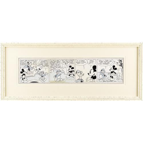 <B>Floyd Gottfredson - Mickey Mouse Daily Comic Strip Original Art, dated 11-25-36 (Walt Disney Enterprises, 1936).</B></I> Our pie-eyed pal wraps up another caper, and discusses the reward money due with fellow adventurers Donald Duck and Goofy. Even at 1930s prices, Donald's idea of how far he can stretch a buck is pretty wild. The original syndicate paste-up with year of publication info is missing, but other than that, this is an exceptional early example of all three characters together. The ink and blue pencil on illustration board art has an image area of 25" x 5.5", and has been professionally matted and framed to an overall size of 34.5" x 14". Mickey, Donald, and Goofy -- the classic cartoon trio! <I>From the Estate of Bruce Hamilton.</B></I> <BR><BR><B>Important notice:</B> Heritage usually auctions material at the rate of 200-250 lots per hour. On some occasions eBay Live bid software or the Internet may not be able to keep up with the pace of the auction. We recommend placing a realistic absentee bid now as insurance to avoid disappointment. Occasionally the auctioneer may eliminate or reject an eBay Live bid, and the auctioneer may also reopen a lot after the close of the eBay live bidding (usually because we missed an audience bid), and may reject your bid even if it shows you as the winning bidder. By bidding via eBay Live, you agree that Heritage may award the lot to another bidder at its sole discretion under the circumstances described above or any other reasonable circumstances. Since eBay bids are not shown to us until we open the lot on the floor, we treat those bids just like floor bids. In most cases the floor responds before the eBay bid is presented to us, due to Internet lag time, so for consistency we have made it a policy that floor bids are always considered first over tie eBay live bids. Also please note that all Heritage lots purchased through eBay Live carry a 22.5% Buyer's Premium. Please make sure you read the Terms and Conditions before you bid. This lot is being auctioned in conjunction with a live floor auction by Heritage Auction Galleries. All final auction and invoice information will be supplied by Heritage Auction Galleries, and all other information should be considered preliminary. Lot:41001 <BR><BR><B>Winning Notification and Billing:</B> After the FINAL session in this auction is complete, Heritage will send e-mail and snail mail invoices. This process normally takes several days. All final auction and invoice information will be supplied by Heritage Auction Galleries, and all other information should be considered preliminary. <BR><BR>This auction will be conducted on a live auction floor and over the Internet through eBay Live. If you choose to place an absentee bid, please take a moment to <font color='#0000ff'><u><a href='http://pages.ebay.com/liveauctions/help/before/laabsentee.html'>learn how eBay Live absentee bidding works</a></u></font><font color='#000000'>