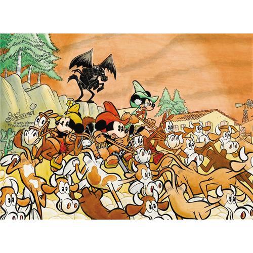 <B>Floyd Gottfredson - "Mickey Mouse and the Bat Bandit" Painting (1982).</B></I> This rip-roaring painting of Mickey Mouse, Minnie Mouse, and Uncle Mortimer Mouse caught in a cattle stampede started by the Bat Bandit was the twenty-first in the series of 24 paintings originally commissioned by collector Malcolm Willits from 1978-83. These spectacular pieces were the only full-scene Mickey Mouse paintings that Floyd Gottfredson did. Gottfredson was the primary creator of the <I>Mickey Mouse</B></I> daily newspaper strip, and his first daily debuted on May 5, 1930. Each painting in the commissioned series was based on a storyline that Gottfredson created for the newspaper strip, and this work was based on "Mickey Mouse and the Bat Bandit," which ran from April 30 through July 28, 1934. The storyline was also used in the 1935 Big Little Book, <B>Mickey Mouse and the Bat Bandit</B></I>. The caption for this work (reproduced on page 29) in <B>The Malcolm Willits Collection of the Mickey Mouse Paintings by Floyd Gottfredson</B></I> reads, "Mickey and Minnie venture out West to a vacation at Uncle Mortimer's ranch. They come to a countryside terrorized by a black-clad villain known as the 'Bat Bandit.' Mickey tries to capture him but is himself blamed for the series of robberies. It takes all of his ingenuity to prove that the notorious thief is none other than Don Jollio, a trusted neighbor and head of the cattlemen's association." This spectacular mixed-media on paper mouse-terpiece has an approximate image area of 21" x 15", and is in Excellent condition. The painting was signed by Gottfredson at the center-left edge. This lot also includes a copy of the Malcolm Willits Collection catalog. <BR><BR><B>Important notice:</B> Heritage usually auctions material at the rate of 200-250 lots per hour. On some occasions eBay Live bid software or the Internet may not be able to keep up with the pace of the auction. We recommend placing a realistic absentee bid now as insurance to avoid disappointment. Occasionally the auctioneer may eliminate or reject an eBay Live bid, and the auctioneer may also reopen a lot after the close of the eBay live bidding (usually because we missed an audience bid), and may reject your bid even if it shows you as the winning bidder. By bidding via eBay Live, you agree that Heritage may award the lot to another bidder at its sole discretion under the circumstances described above or any other reasonable circumstances. Since eBay bids are not shown to us until we open the lot on the floor, we treat those bids just like floor bids. In most cases the floor responds before the eBay bid is presented to us, due to Internet lag time, so for consistency we have made it a policy that floor bids are always considered first over tie eBay live bids. Also please note that all Heritage lots purchased through eBay Live carry a 22.5% Buyer's Premium. Please make sure you read the Terms and Conditions before you bid. This lot is being auctioned in conjunction with a live floor auction by Heritage Auction Galleries. All final auction and invoice information will be supplied by Heritage Auction Galleries, and all other information should be considered preliminary. Lot:41001 <BR><BR><B>Winning Notification and Billing:</B> After the FINAL session in this auction is complete, Heritage will send e-mail and snail mail invoices. This process normally takes several days. All final auction and invoice information will be supplied by Heritage Auction Galleries, and all other information should be considered preliminary. <BR><BR>This auction will be conducted on a live auction floor and over the Internet through eBay Live. If you choose to place an absentee bid, please take a moment to <font color='#0000ff'><u><a href='http://pages.ebay.com/liveauctions/help/before/laabsentee.html'>learn how eBay Live absentee bidding works</a></u></font><font color='#000000'>