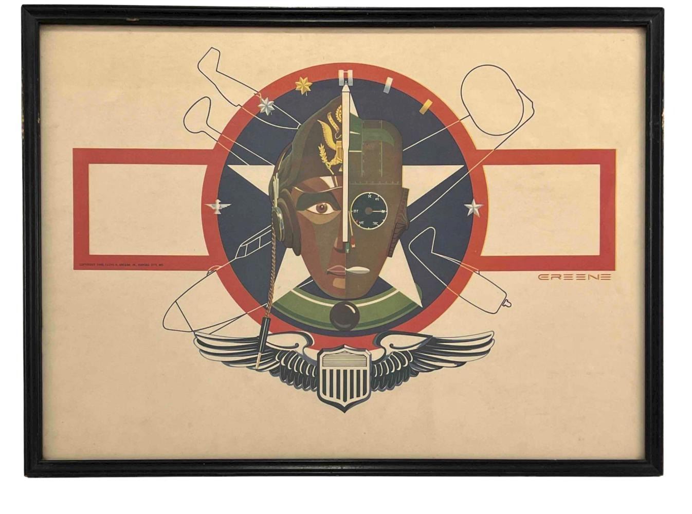 Floyd H. Greene, WWII Abstract Military Aviation, Print on Paper. Marked Greene, Copyright 1946, Floyd H. Greene, Jr., Kansas City, Mo. Approximately 19.0L x 14.0W in. Sight Approximately 18.0L x 13.0W in.